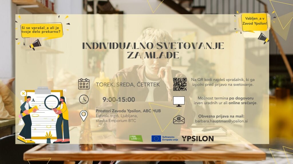 Za uradne ure smo vam na voljo od torka do četrtka in sicer med 9:00 in 15:00. Svetovanja potekajo v prostorih Zavoda Ypsilon, v ABC Hub-u, ki se nahaja v stavbi BTC Emporiuma (Latinski trg 6, 1000 Ljubljana). Individualna svetovanja so možna tudi preko spleta in po dogovoru tudi izven uradnih ur. Vsakemu posamezniku pripada ena ura svetovanja. Za lažjo pripravo na vaš dotičen primer, pa prosimo, temeljito izpolnite spodnji vprašalnik ali pa kontaktirajte neposredno na elektronski nalov: barbara.hauptman@ypsilon.si